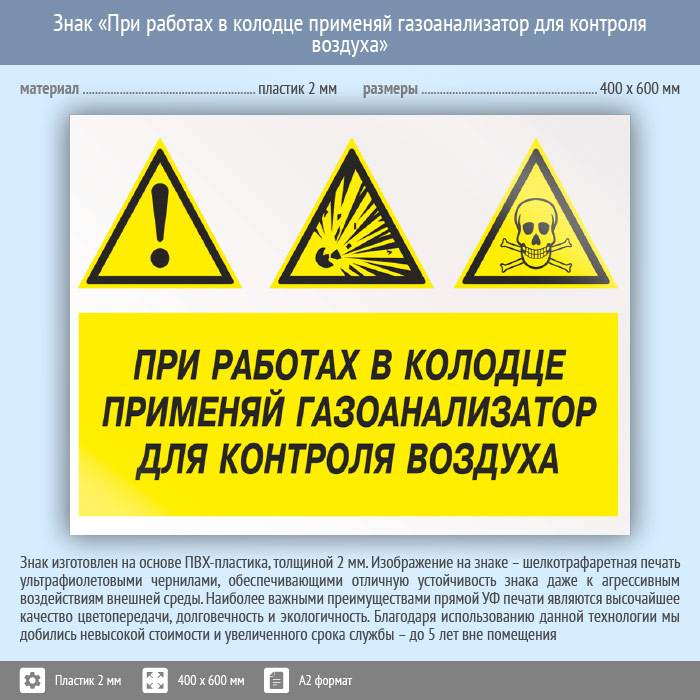 Знак «При работах в колодце применяй газоанализатор для контроля воздуха», КЗ-74 (пластик, 600х400 мм) в Ставрополе купить