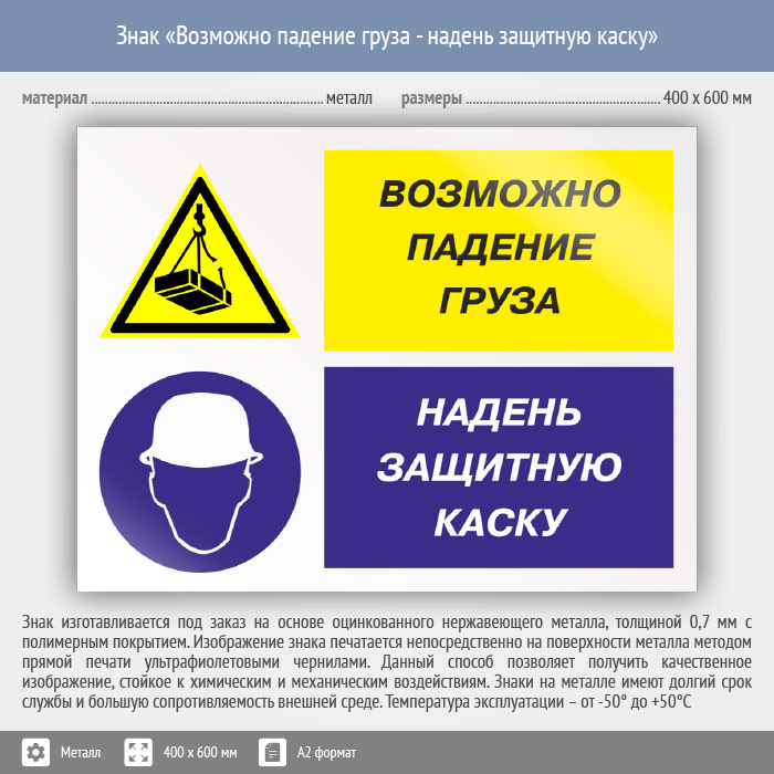 Знак «Возможно падение груза - надень защитную каску», КЗ-17 (металл, 600х400 мм) в Ставрополе купить