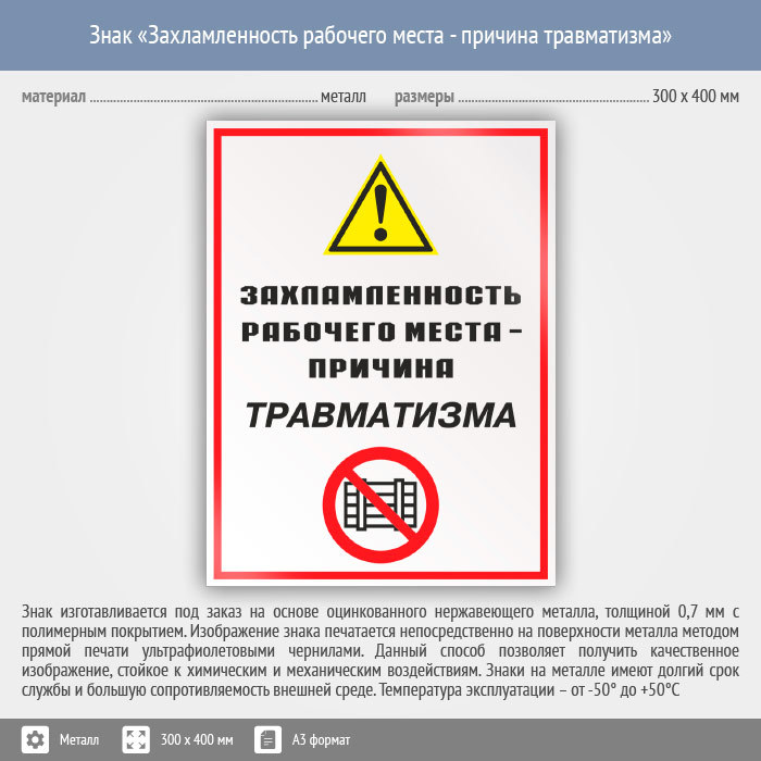 Знак «Захламленность рабочего места - причина травматизма», КЗ-21 (металл, 300х400 мм) в Ставрополе купить