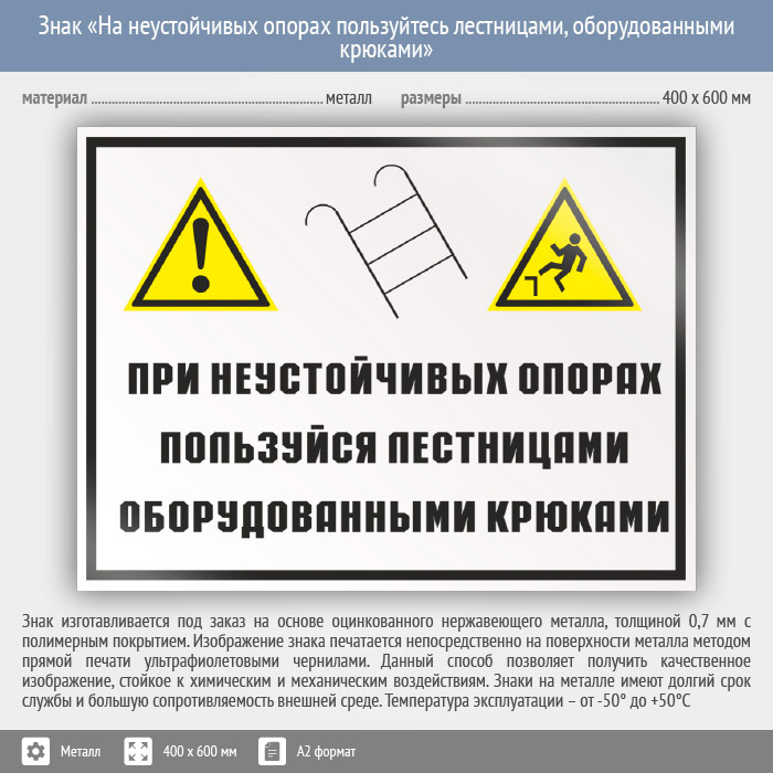 Знак «На неустойчивых опорах пользуйтесь лестницами, оборудованными крюками», КЗ-22 (металл, 600х400 мм) в Ставрополе купить