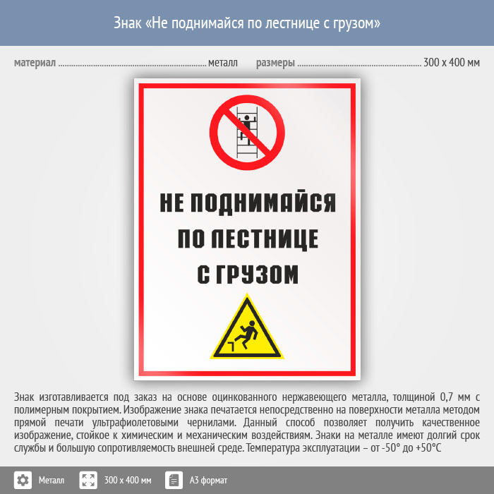 Знак «Не поднимайся по лестнице с грузом», КЗ-28 (металл, 300х400 мм) в Ставрополе купить