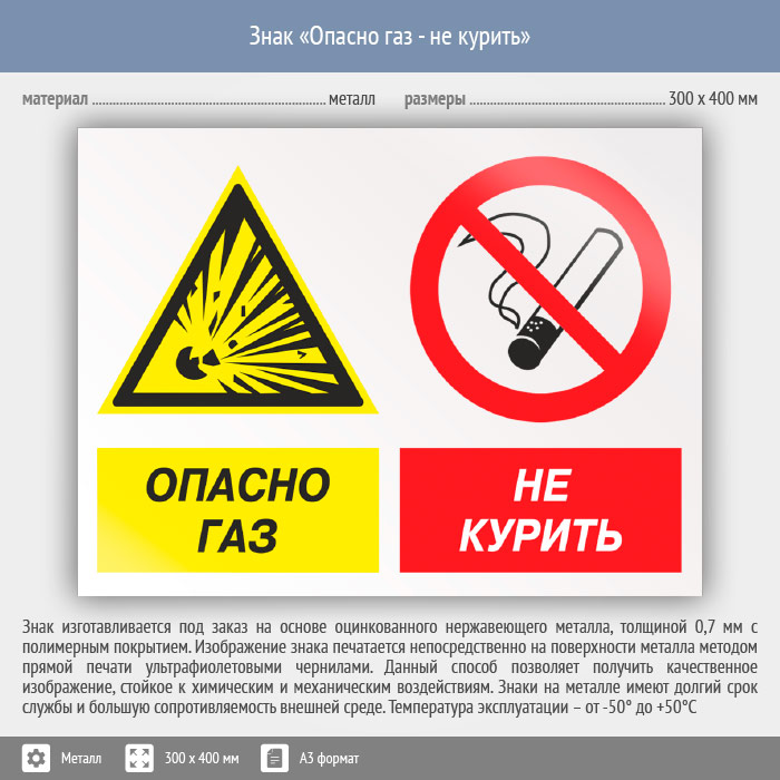 Знак «Опасно газ - не курить», КЗ-44 (металл, 400х300 мм) в Ставрополе купить