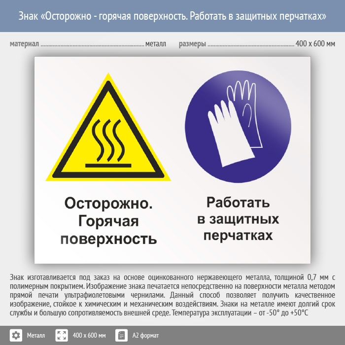 Знак «Осторожно - горячая поверхность. Работать в защитных перчатках», КЗ-55 (металл, 600х400 мм) в Ставрополе купить