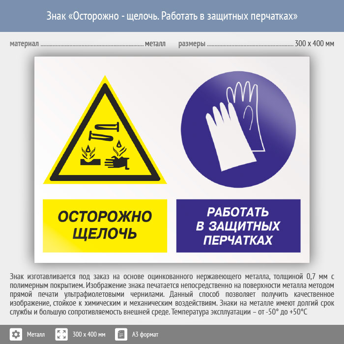 Знак «Осторожно - щелочь. Работать в защитных перчатках», КЗ-60 (металл, 400х300 мм) в Ставрополе купить