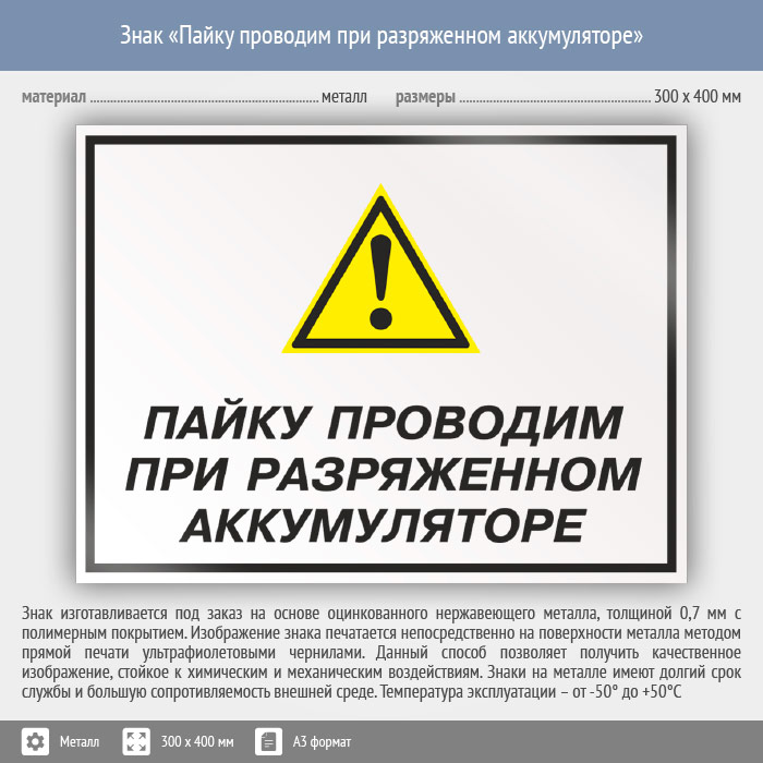 Знак «Пайку проводим при разряженном аккумуляторе», КЗ-62 (металл, 400х300 мм) в Ставрополе купить
