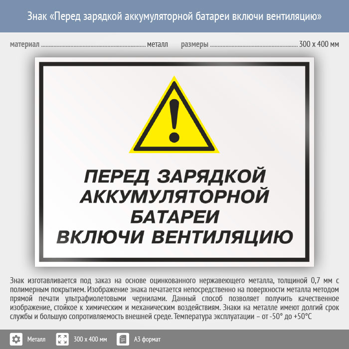Знак «Перед зарядкой аккумуляторной батареи включи вентиляцию», КЗ-63 (металл, 400х300 мм) в Ставрополе купить