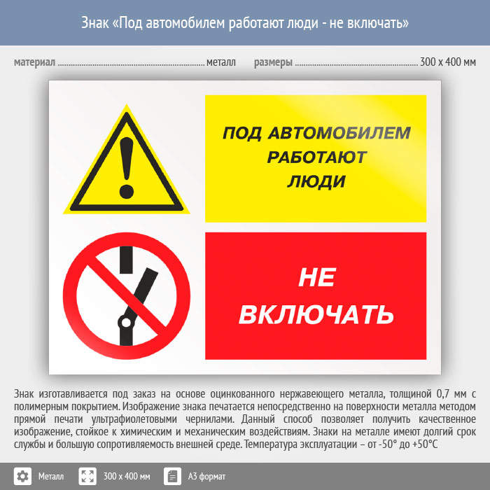 Знак «Под автомобилем работают люди - не включать», КЗ-65 (металл, 400х300 мм) в Ставрополе купить
