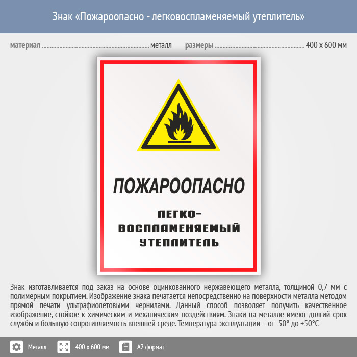 Знак «Пожароопасно - легковоспламеняемый утеплитель», КЗ-68 (металл, 400х600 мм) в Ставрополе купить
