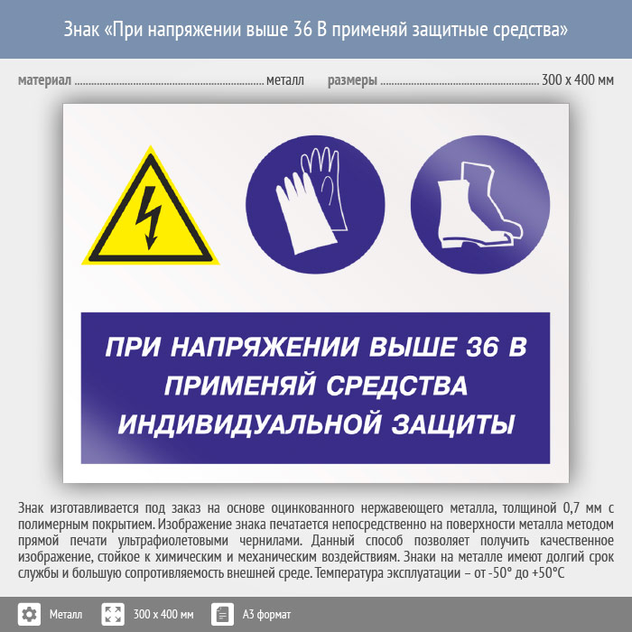 Знак «При напряжении выше 36 В применяй защитные средства», КЗ-71 (металл, 400х300 мм) в Ставрополе купить