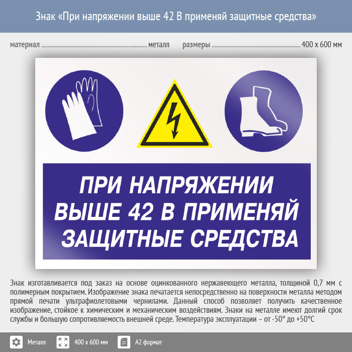Знак «При напряжении выше 42 В применяй защитные средства», КЗ-72 (металл, 600х400 мм) в Ставрополе купить
