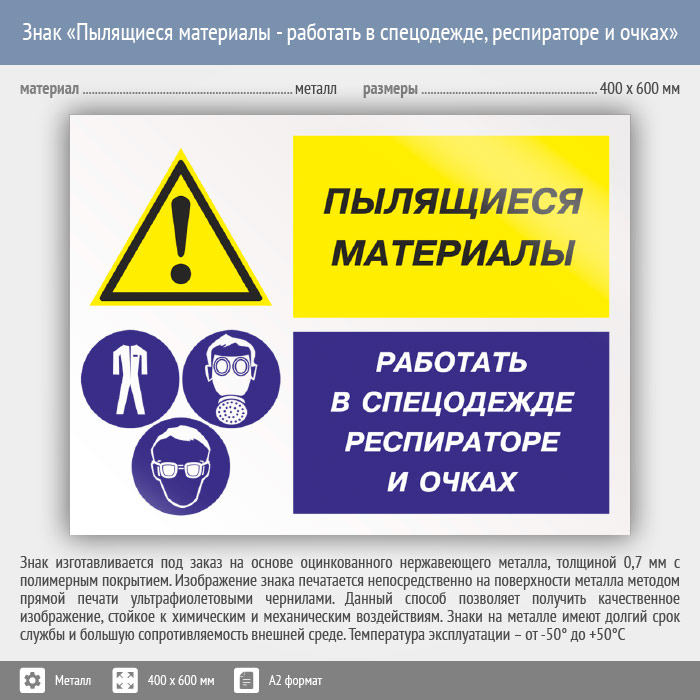 Знак «Пылящиеся материалы - работать в спецодежде, респираторе и очках», КЗ-79 (металл, 600х400 мм) в Ставрополе купить