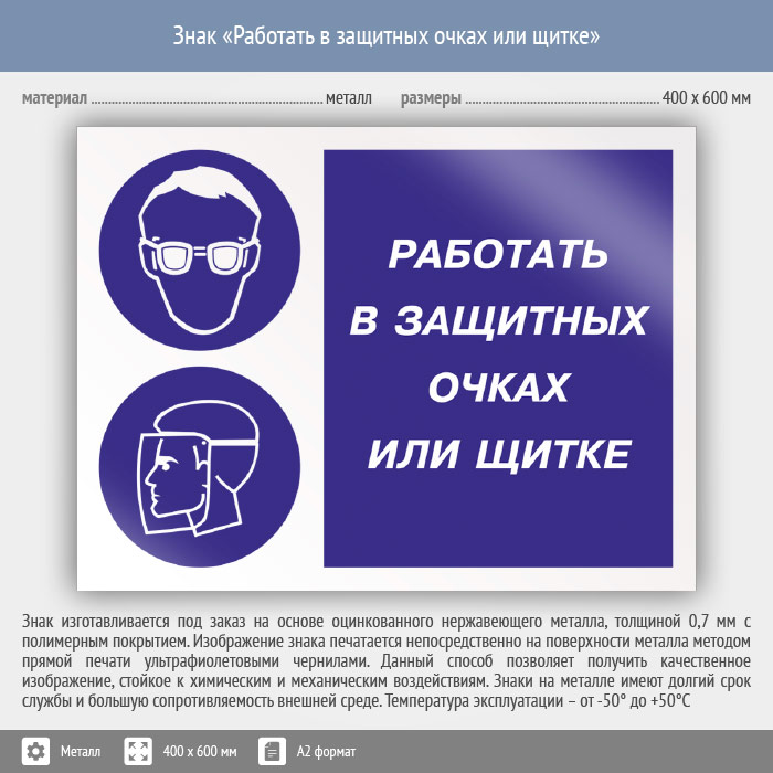 Знак «Работать в защитных очках или щитке», КЗ-80 (металл, 600х400 мм) в Ставрополе купить