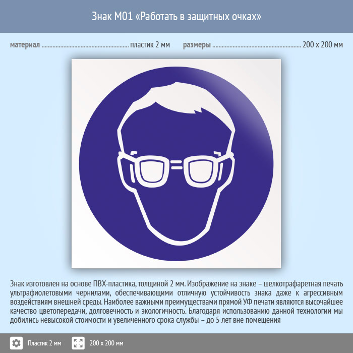 Знак M01 «Работать в защитных очках» (пластик, 200х200 мм) в Ставрополе купить