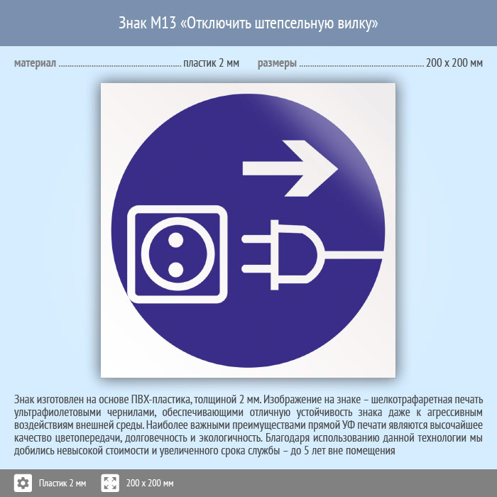 Знак M13 «Отключить штепсельную вилку» (пластик, 200х200 мм) в Ставрополе купить
