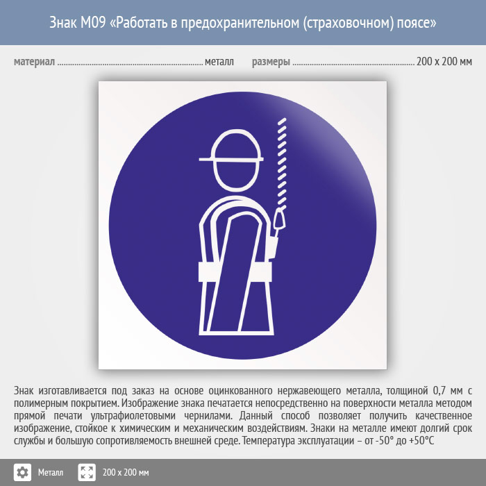 Знак M09 «Работать в предохранительном (страховочном) поясе» (металл, 200х200 мм) в Ставрополе купить
