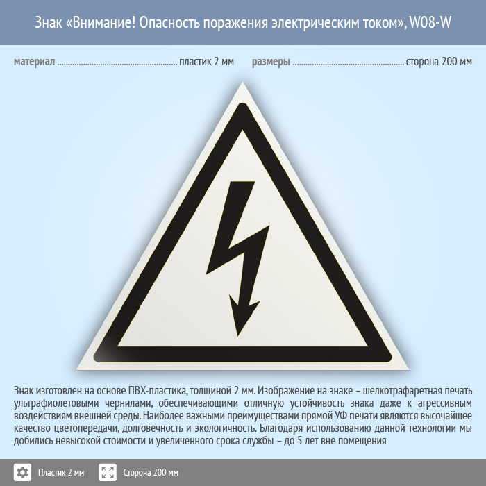 Знак W08-W «Внимание! опасность поражения электрическим током» (белый, пластик, сторона 200 мм) в Ставрополе купить