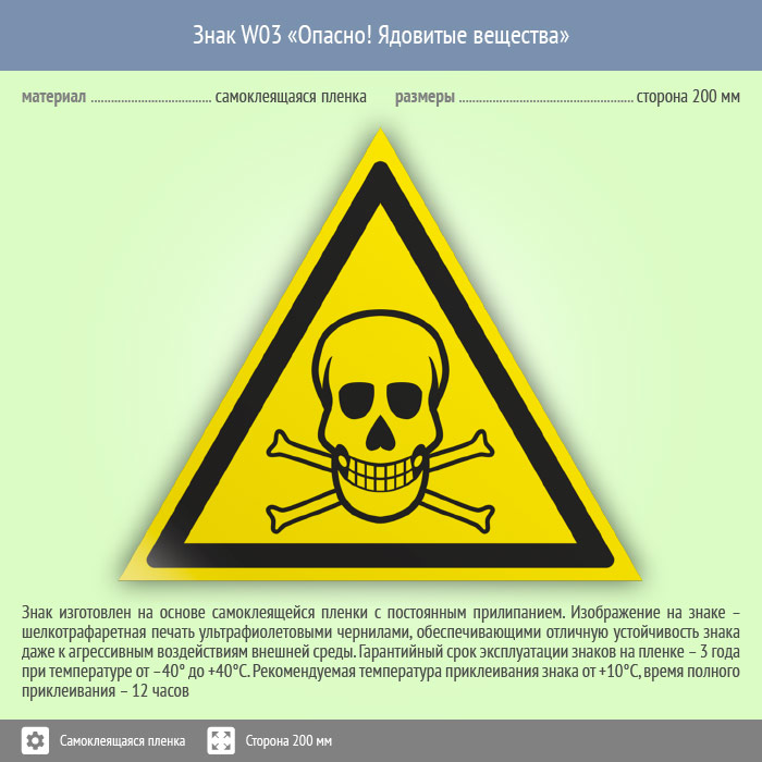 Знак W03 «Опасно! ядовитые вещества» (пленка, сторона 200 мм) в Ставрополе купить