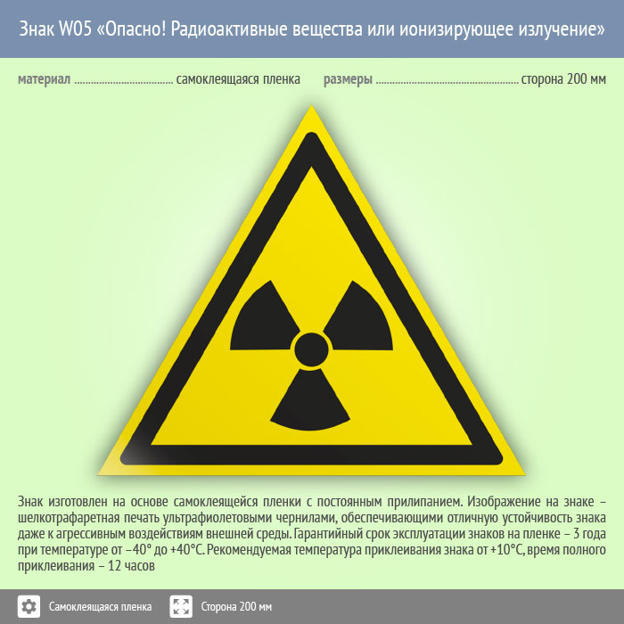 Знак W05 «Опасно! радиоактивные вещества или ионизирующее излучение» (пленка, сторона 200 мм) в Ставрополе купить