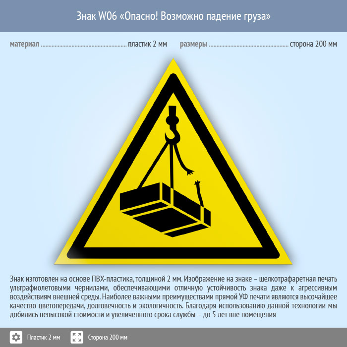 Знак W06 «Опасно! возможно падение груза» (пластик, сторона 200 мм) в Ставрополе купить