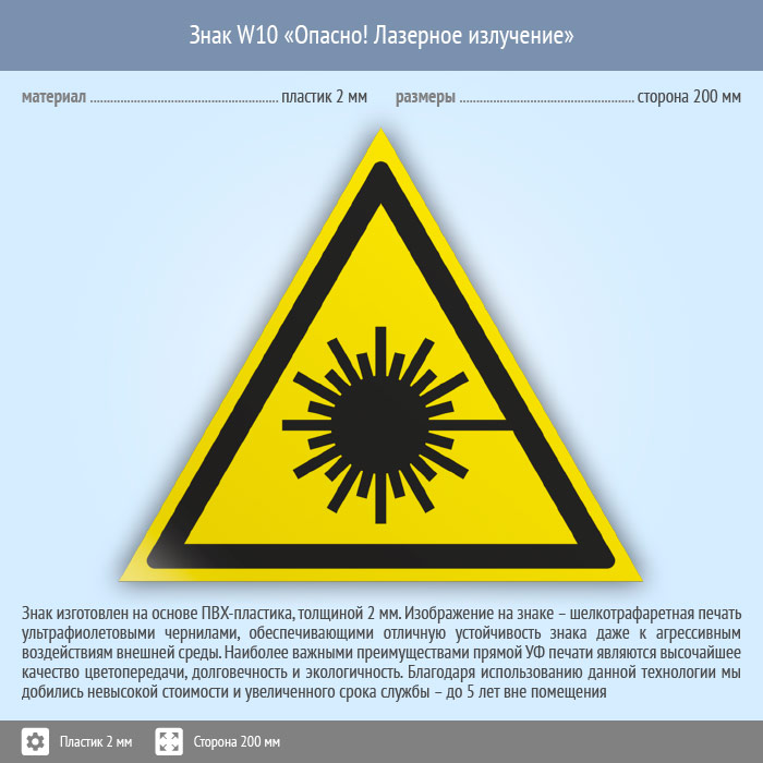 Знак W10 «Опасно! лазерное излучение» (пластик, сторона 200 мм) в Ставрополе купить