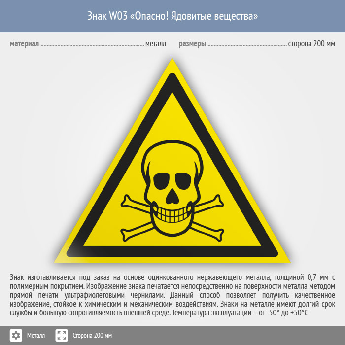 Знак W03 «Опасно! ядовитые вещества» (металл, сторона 200 мм) в Ставрополе купить
