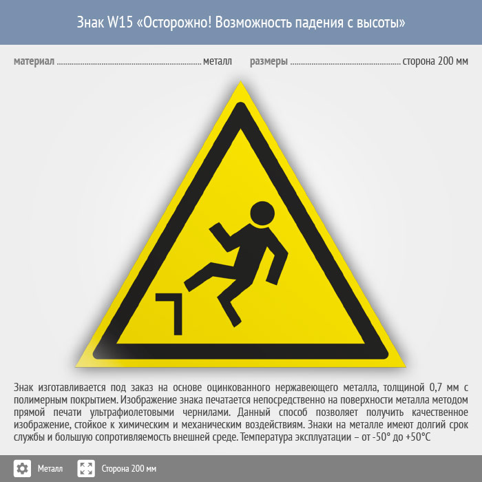 Знак W15 «Осторожно! возможность падения с высоты» (металл, сторона 200 мм) в Ставрополе купить