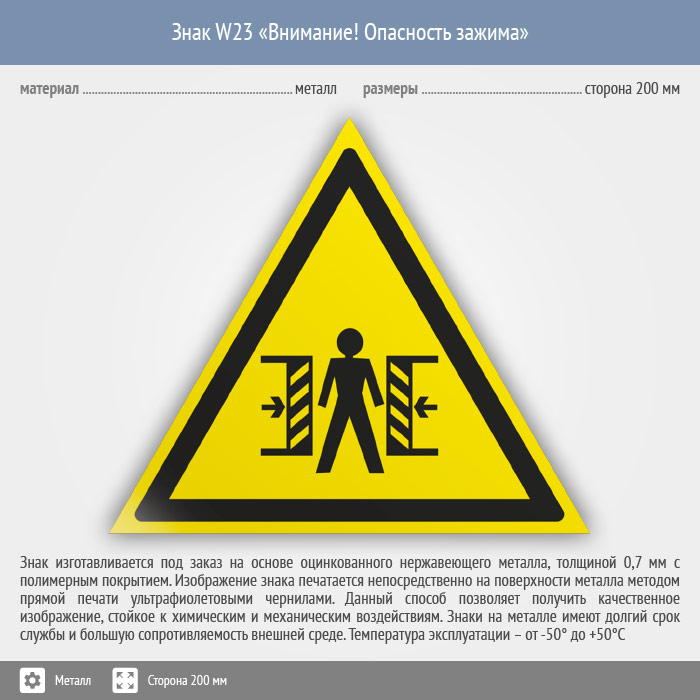 Знак W23 «Внимание! опасность зажима» (металл, сторона 200 мм) в Ставрополе купить