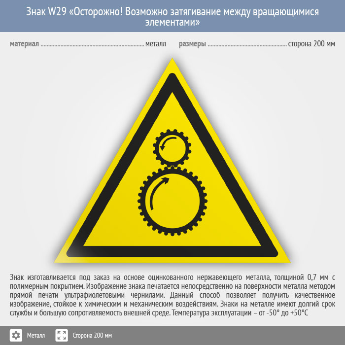 Знак W29 «Осторожно! возможно затягивание между вращающимися элементами» (металл, сторона 200 мм) в Ставрополе купить