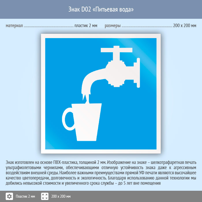 Знак D02 «Питьевая вода» (пластик, 200х200 мм) в Ставрополе купить