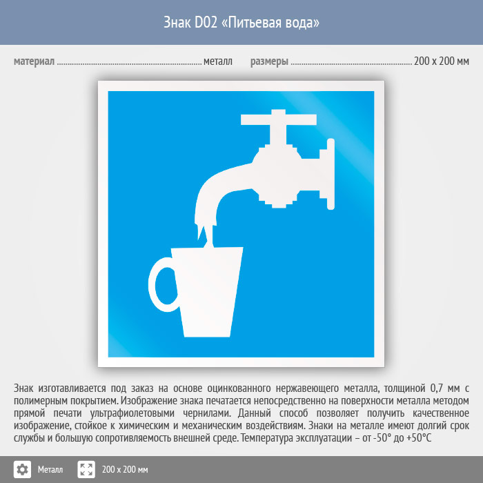 Знак D02 «Питьевая вода» (металл, 200х200 мм) в Ставрополе купить