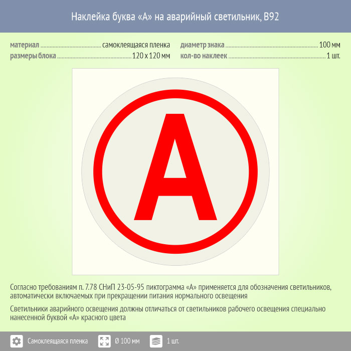 Наклейка буква «А» на аварийный светильник, B92 (пленка, диаметр 100 мм, 120х120 мм) в Ставрополе купить