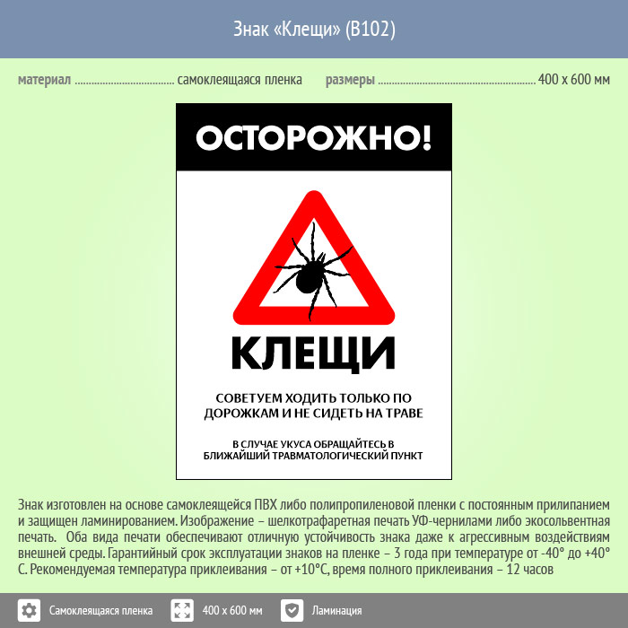 Знак «Осторожно! Клещи», B102 (пленка c ламинированием, 300х400 мм) в Ставрополе купить