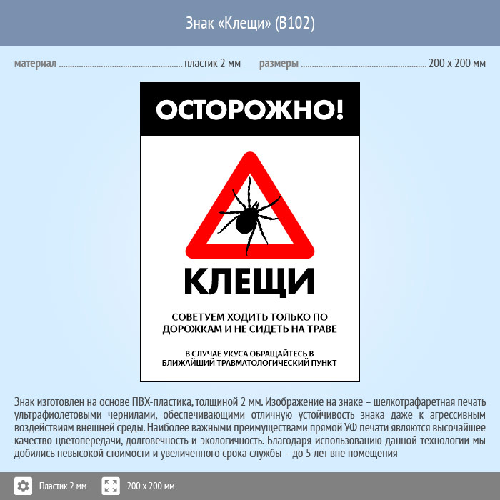Знак «Осторожно! Клещи», B102 (пластик, 400х600 мм) в Ставрополе купить
