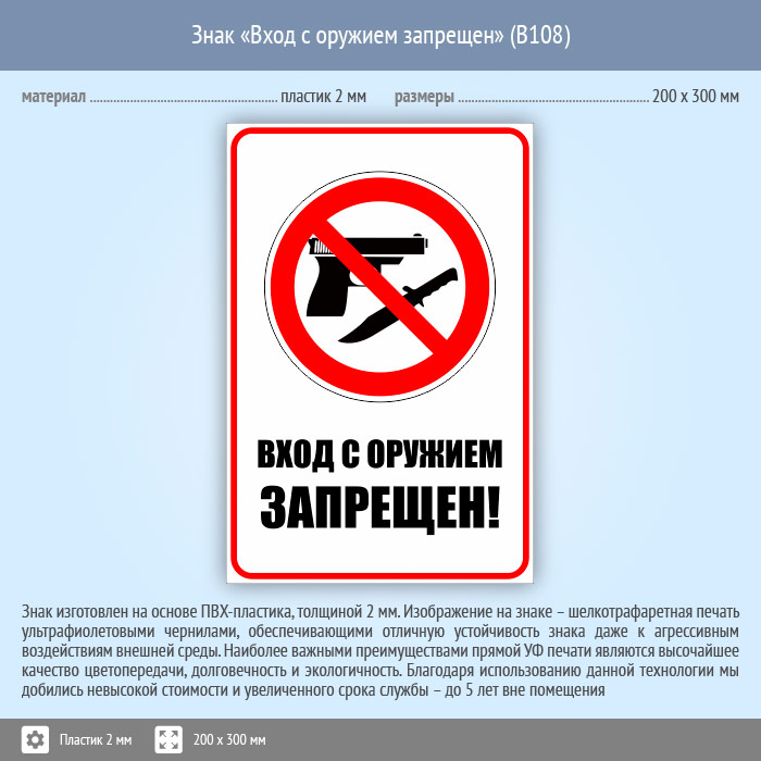Знак «Вход с оружием запрещен», B108 (пластик, 200х300 мм) в Ставрополе купить