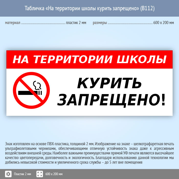 Табличка «На территории школы курить запрещено», B112 (пластик, 600х200 мм) в Ставрополе купить