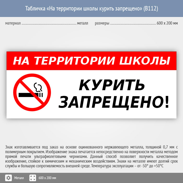 Табличка «На территории школы курить запрещено», B112 (металл, 600х200 мм) в Ставрополе купить