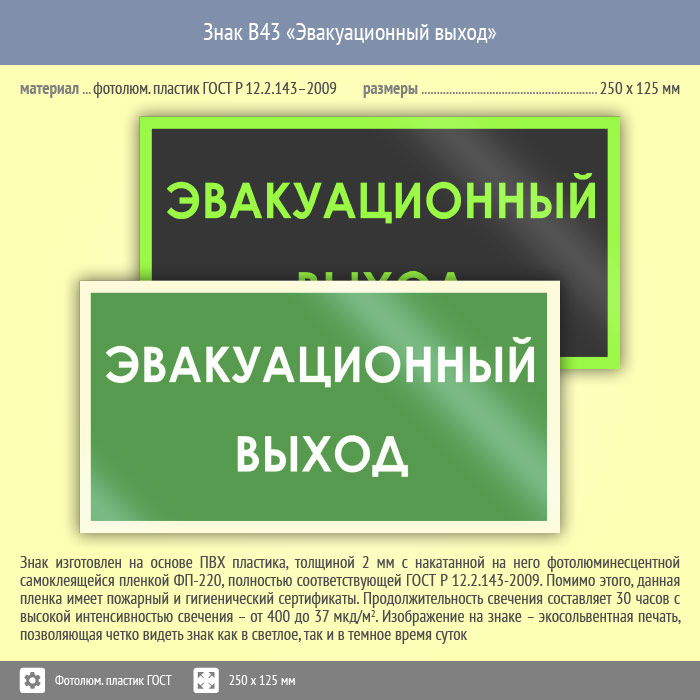 Знак B43 «Эвакуационный выход» (фотолюминесцентный пластик ГОСТ 34428-2018, 250х125 мм) в Ставрополе купить