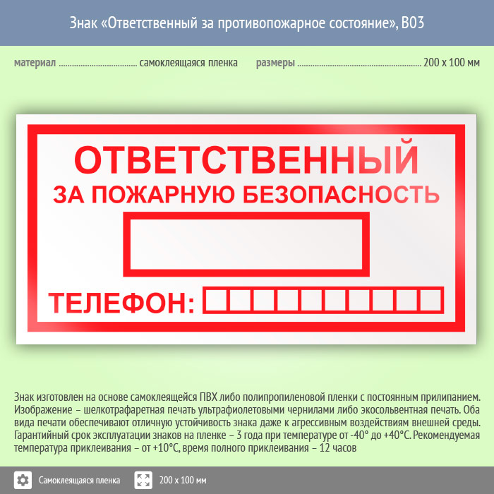 Знак «Ответственный за пожарную безопасность», B03 (пленка, 200х100 мм) в Ставрополе купить
