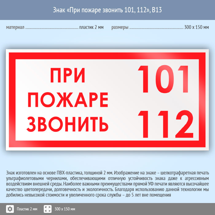 Знак «При пожаре звонить 101, 112», B13 (пластик, 300х150 мм) в Ставрополе купить