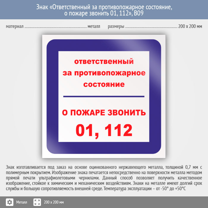Знак «Ответственный за противопожарное состояние, о пожаре звонить 01, 112», B09 (металл, 200х200 мм) в Ставрополе купить