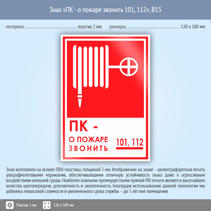 Знак «ПК - о пожаре звонить 101, 112», B15 (пластик, 120х180 мм) в Ставрополе купить