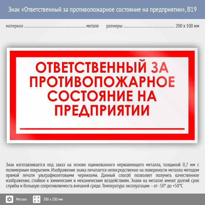 Знак «Ответственный за противопожарное состояние на предприятии», B19 (металл, 200х100 мм) в Ставрополе купить