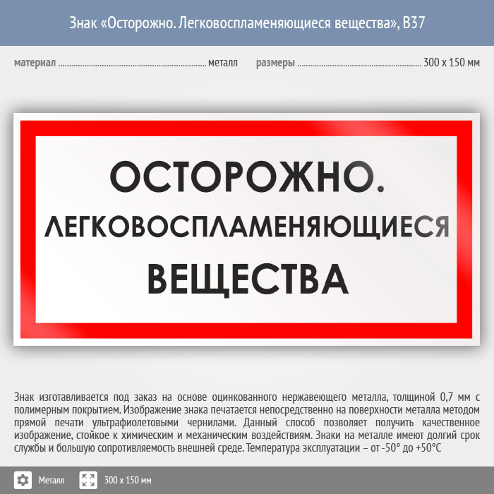 Знак «Осторожно. Легковоспламеняющиеся вещества», B37 (металл, 300х150 мм) в Ставрополе купить