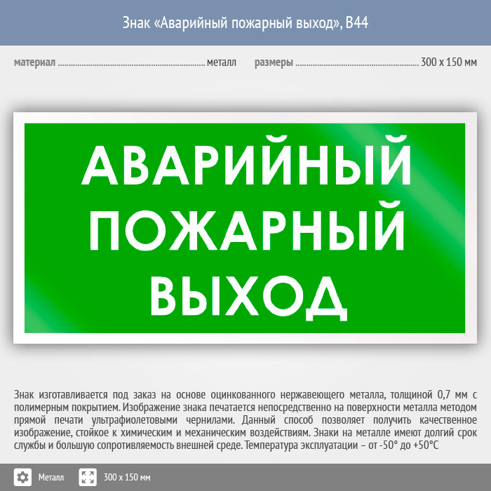 Знак «Аварийный пожарный выход», B44 (металл, 300х150 мм) в Ставрополе купить