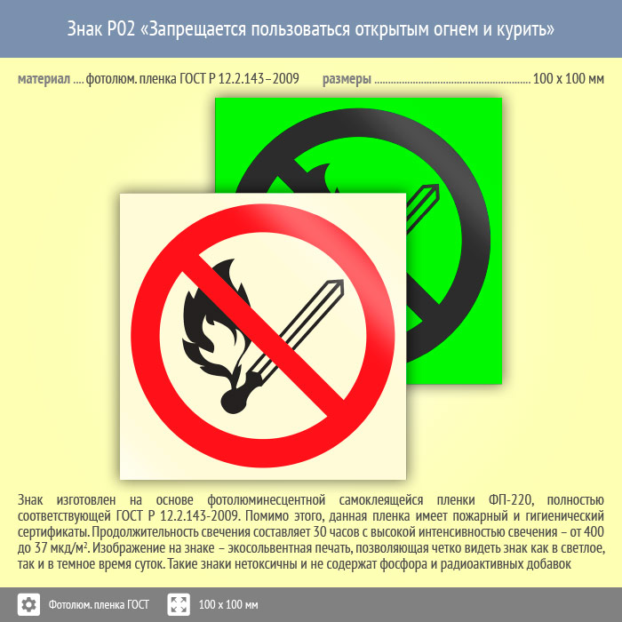 Знак P02 «Запрещается пользоваться открытым огнем и курить» (фотолюминесцентная пленка ГОСТ 34428-2018, 100х100 мм) в Ставрополе купить