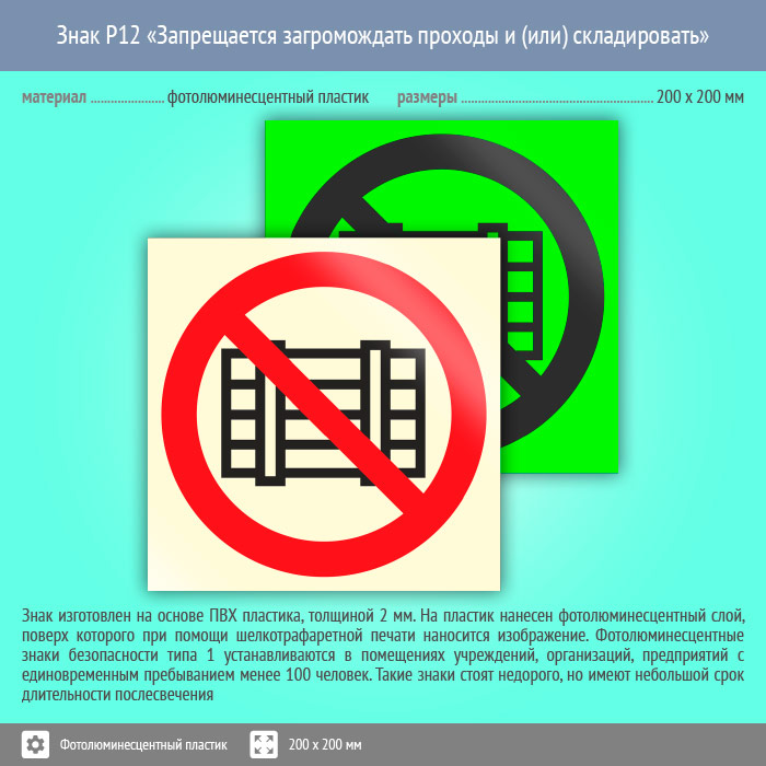 Знак P12 «Запрещается загромождать проходы и (или) складировать» (фотолюминесцентный пластик, 200х200 мм) в Ставрополе купить
