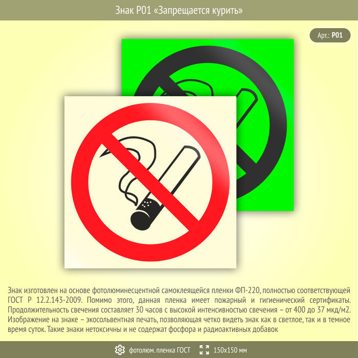 Знак P01 «Запрещается курить» (фотолюминесцентная пленка ГОСТ 34428-2018, 150х150 мм) в Ставрополе купить