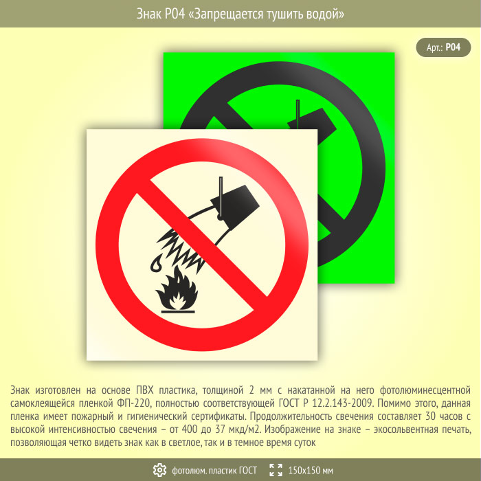 Знак P04 «Запрещается тушить водой» (фотолюминесцентный пластик ГОСТ 34428-2018, 150х150 мм) в Ставрополе купить