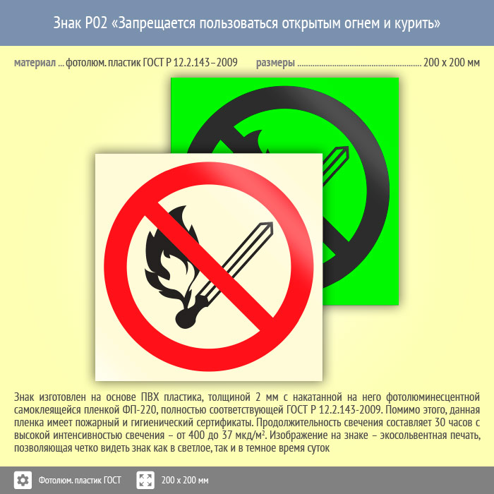 Знак P02 «Запрещается пользоваться открытым огнем и курить» (фотолюминесцентный пластик ГОСТ 34428-2018, 200х200 мм) в Ставрополе купить