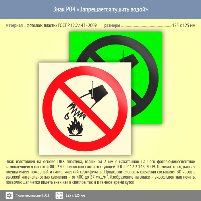 Знак P04 «Запрещается тушить водой» (фотолюминесцентный пластик ГОСТ 34428-2018, 125х125 мм) в Ставрополе купить